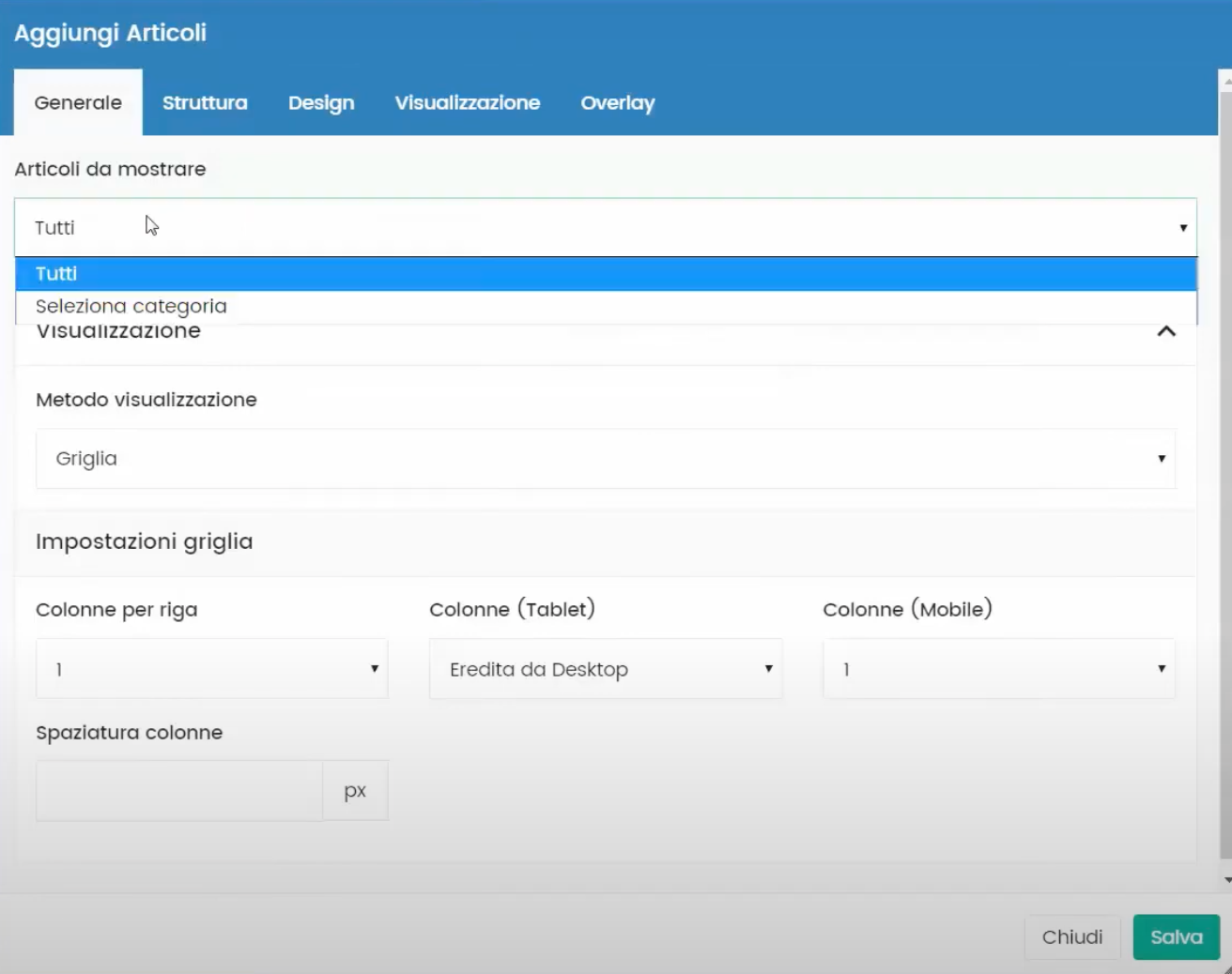 Dentro da tela de criação do conteúdo dinâmico Artigos na aba Geral, na seção Artigos a serem exibidos, poderíamos decidir se visualizar todos os artigos ou apenas os artigos de uma determinada categoria.