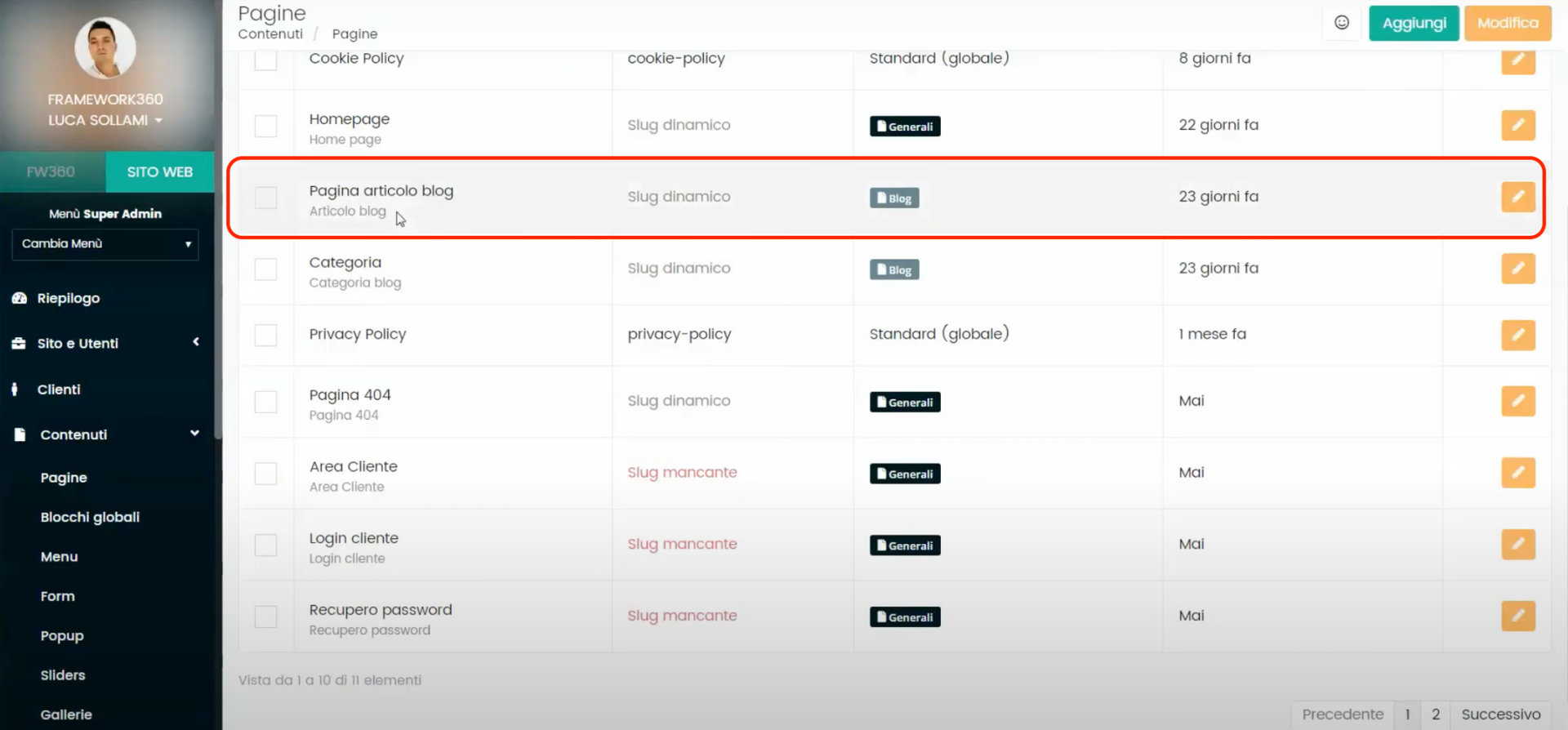 Depois de instalar o plugin Blog , encontraremos no menu principal do Framework360 a opção Blog, dentro da qual poderemos gerenciar a seção de blog do nosso site, como veremos nos próximos passos.