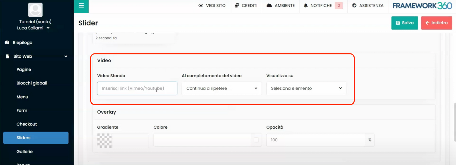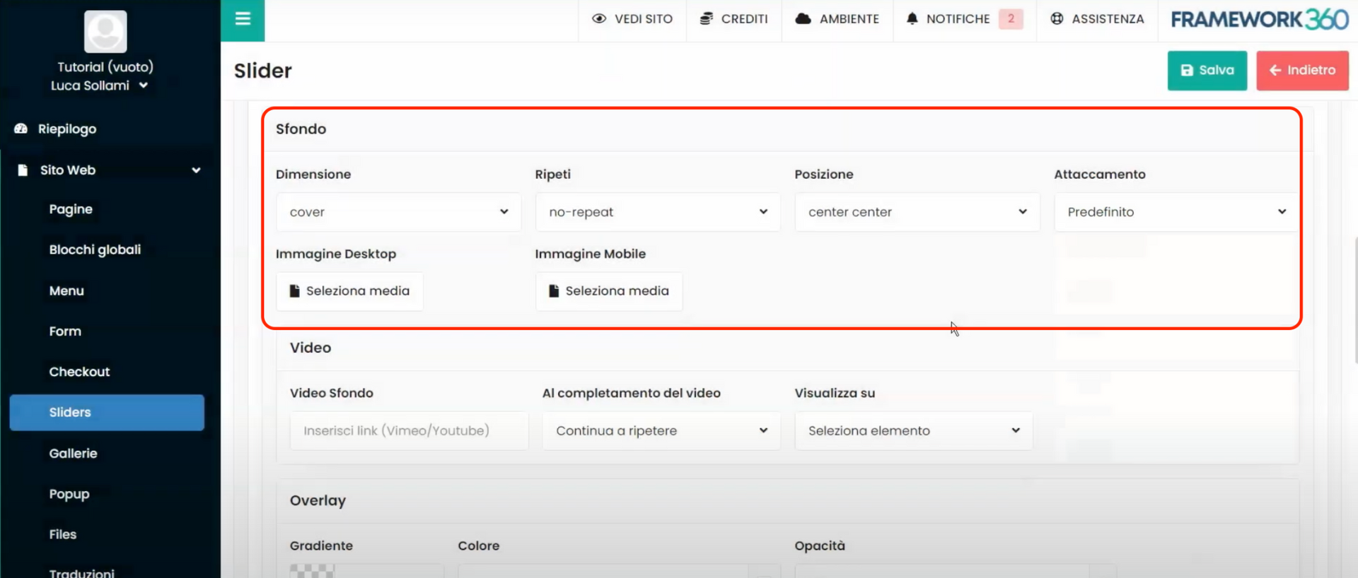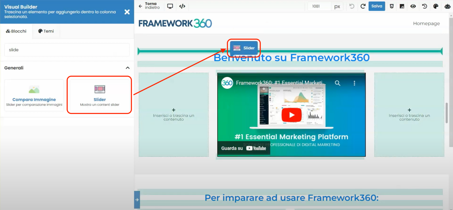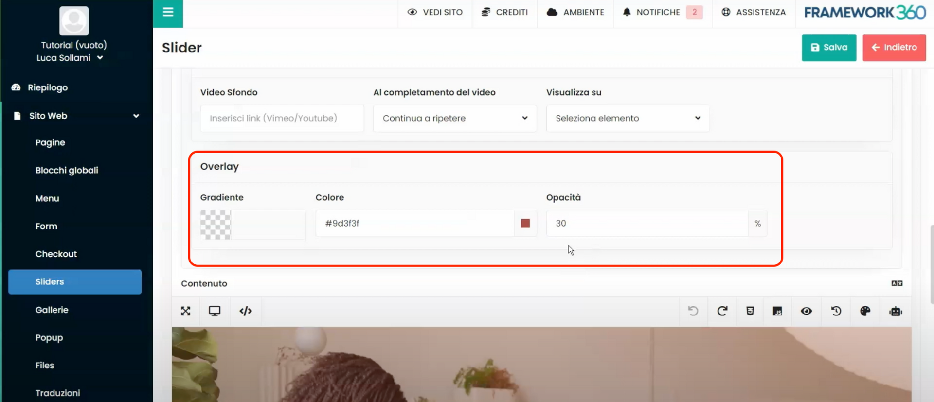 Dentro deste tutorial, vamos ver como criar um slider e adicioná-lo a um site web construído no Framework360. Um slider é um conteúdo que geralmente é adicionado na primeira parte da página inicial do site web. O slider é composto por uma imagem, um carrossel de imagens ou um vídeo, e acima do conteúdo multimídia há um título e uma descrição.