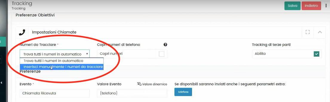 A este ponto, o Framework360 nos permite, através de um menu suspenso como mostrado na figura, escolher se rastrear todos os números de telefone presentes no site ou selecionar manualmente os números a serem rastreados. Além disso, teremos a possibilidade de escolher se os números de telefone a serem rastreados são visíveis no site ou ocultos.